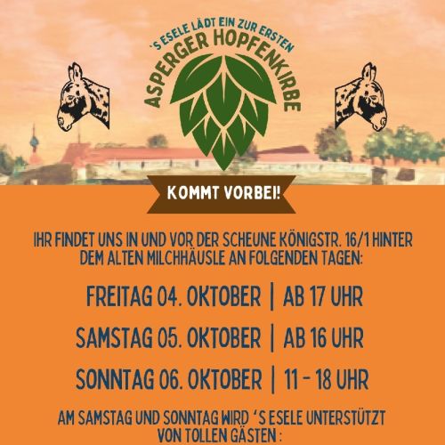 From October 4th to October 6th, `s Esele celebrates its 5th anniversary with the Asperger Hopfenkirbe. Guests will be catered for by the Adler Asperg.